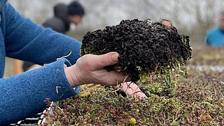 Das Verbundvorhaben Klimafarm der Stiftung Naturschutz Schleswig-Holstein in Erfde erprobt die nasse Bewirtschaftung von Grünlandflächen auf Moorböden in der Praxis. Hierfür werden trockengelegte, landwirtschaftlich genutzte Flächen wiedervernässt. Auf diesen sowie weiteren Flächen mit insgesamt 405 Hektar wird Mahdgut von nassen Grünlandflächen gewonnen. Dabei sollen geeignete Verfahren zur Ernte, für den Abtransport des Ernteguts sowie zur Herstellung und Vermarktung von Folgeprodukten sowie entsprechende Verwertungs- und Wertschöpfungsketten in der Praxis erprobt und untersucht werden – etwa die Veredelung von Gras bzw. Graspellets zu Pflanzenkohle, Substratplatten für Dachbegrünung oder Erosionschutzmatten für Veranstaltungen. Ziel ist es, für Landwirtinnen und Landwirte lohnende Alternativen zur herkömmlichen Nutzung zu entwickeln und aufzuzeigen, um mehr Akzeptanz für die klimafreundliche Bewirtschaftung nasser Böden zu schaffen.