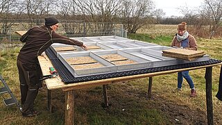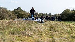 Das Verbundvorhaben Klimafarm der Stiftung Naturschutz Schleswig-Holstein in Erfde erprobt die nasse Bewirtschaftung von Grünlandflächen auf Moorböden in der Praxis. Hierfür werden trockengelegte, landwirtschaftlich genutzte Flächen wiedervernässt. Auf diesen sowie weiteren Flächen mit insgesamt 405 Hektar wird Mahdgut von nassen Grünlandflächen gewonnen. Dabei sollen geeignete Verfahren zur Ernte, für den Abtransport des Ernteguts sowie zur Herstellung und Vermarktung von Folgeprodukten sowie entsprechende Verwertungs- und Wertschöpfungsketten in der Praxis erprobt und untersucht werden – etwa die Veredelung von Gras bzw. Graspellets zu Pflanzenkohle, Substratplatten für Dachbegrünung oder Erosionschutzmatten für Veranstaltungen. Ziel ist es, für Landwirtinnen und Landwirte lohnende Alternativen zur herkömmlichen Nutzung zu entwickeln und aufzuzeigen, um mehr Akzeptanz für die klimafreundliche Bewirtschaftung nasser Böden zu schaffen.