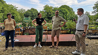 Ein besonderes Format war das „Politische Speeddating", bei dem Jugendliche direkt mit Vertreter*innen der Stadt und des Landkreises ins Gespräch kamen. Unter anderem mit dabei: Toni Loitsch, Klimaschutzmanager der Stadt Cottbus, Martin Bock, Jugendhilfeplaner, und Stefanie Schuster, Gleichstellungs- und Jugendbeteiligungsbeauftragte des Landkreises Spree-Neiße. Ziel war es, Bedarfe und Ideen für eine jugendgerechte und klimaresiliente Stadtentwicklung direkt vor Ort zu besprechen.