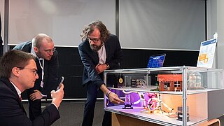 Beim Besuch des Eurotheums am 22. Oktober konnte sich Dr. Christiane Rohleder das vom Kooperationspartner Cloud&Heat Technologies GmbH betriebene Rechenzentrum in der siebten Etage des Eurotheum genauer anschauen. Im Gegensatz zu vielen anderen Rechenzentren, wird dieses statt mit Luft mit Wasser gekühlt. Bei dieser Form der Klimatisierung hat die so gewonnene Abwärme bereits ein Temperaturniveau, das unmittelbar für die Warmwasserversorgung und zum Heizen eingesetzt werden kann. Vom Eurotheum aus werden zentrale Daten für die Projektarbeit geliefert.