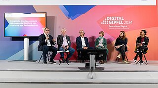 In einer anschließenden Panel-Diskussion stellte Dr. Ralph Hintemann vom Projekt DC2HEAT das Leuchtturmprojekt als Best-Practice-Beispiel vor. Dr. Christiane Rohleder tauschte sich unter anderem mit Vertreter:innen des Bundeswirtschaftsministeriums und Dr. Ralph Hintemann zu den Potenzialen aus, die KI für die klimafreundliche Nutzung von Abwärme aus Rechenzentren bereithält. Hierbei wurden vor allem auch Herausforderungen und Hemmnisse, die bei der Umsetzung der Abwärmenutzung auftreten können, thematisiert.