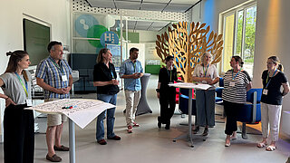 Nach einem ersten Austausch im Forum „Seen & Entdecken“ in Düren wurden die Nachhaltigkeitsmanager*innen von Christian Rast, Geschäftsführer der Entwicklungsgesellschaft indeland GmbH, begrüßt. Die Entwicklungsgesellschaft ist ein Zusammenschluss aus Städten und Gemeinden rund um den Tagebau Inden sowie dem Kreis Düren und verfolgt das Ziel, den Wandel in der Region aktiv nachhaltig zu gestalten. Hier fördert das Bundesumweltministerium über das KoMoNa-Programm eine Personalstelle für eine Nachhaltigkeitsmanagerin und Umsetzungsmaßnahmen des Nachhaltigkeitskonzepts.