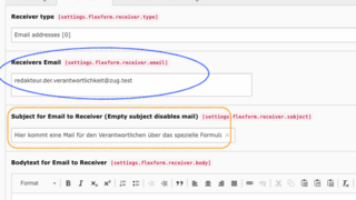 - Subject for Email to Receiver (orange) muss ausgefüllt sein, sonst erhält der verantwortliche Redakteur keine E-Mail.